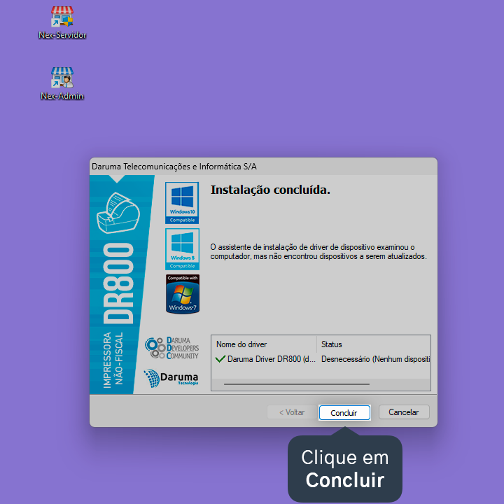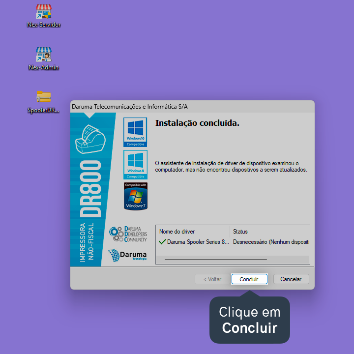Pronto! A impressora Daruma DR800 foi instalada no Windows.