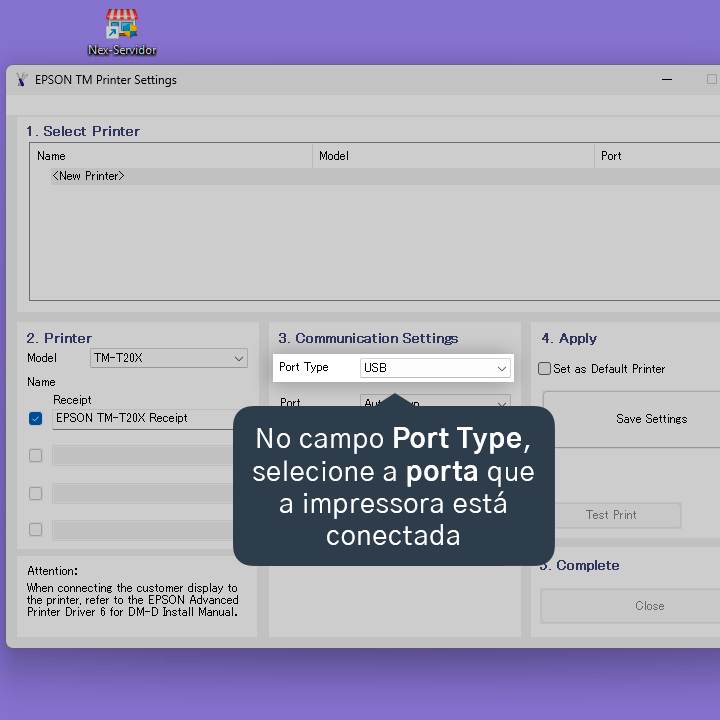 6. No campo Port Type, selecione a porta na qual o cabo da impressora está conectado no seu computador.