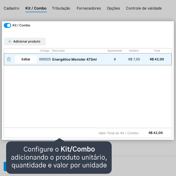 Na aba de kit/combo, será vinculado o produto unitário, informado a quantidade que é vendida dentro da caixa e o preço que cada produto unitário terá dentro dessa caixa, podendo ter o mesmo valor ou um valor com desconto pela compra da caixa fechada. Clique aqui para mais detalhes sobre como criar um kit/combo.