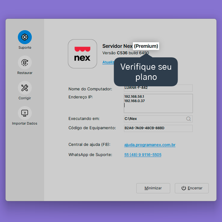 O Nex em rede está disponível para assinantes dos planos Premium e Fiscal. Caso o seu computador terminal não esteja localizando o computador servidor, verifique o seu plano. Você pode consultar seu plano diretamente pelo Nex Servidor.