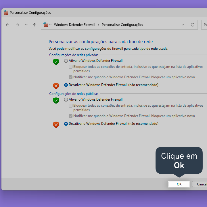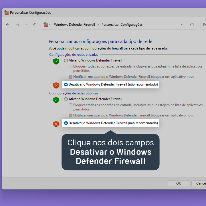 6.3. Clique nos dois campos Desativar o Windows Defender Firewall.