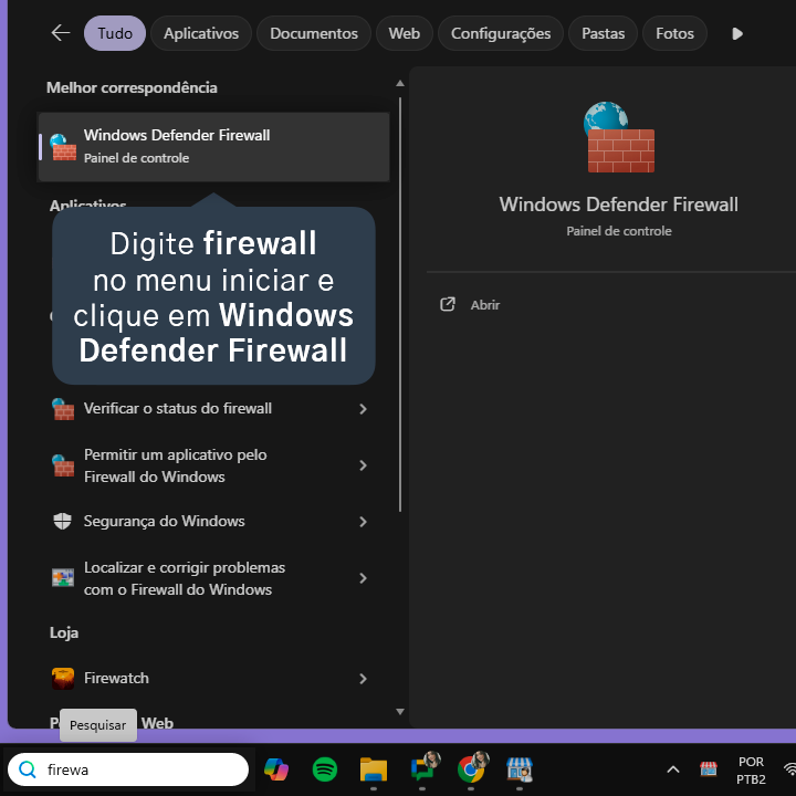 6.1. Digite firewall no menu iniciar e clique em Windows Defender Firewall.