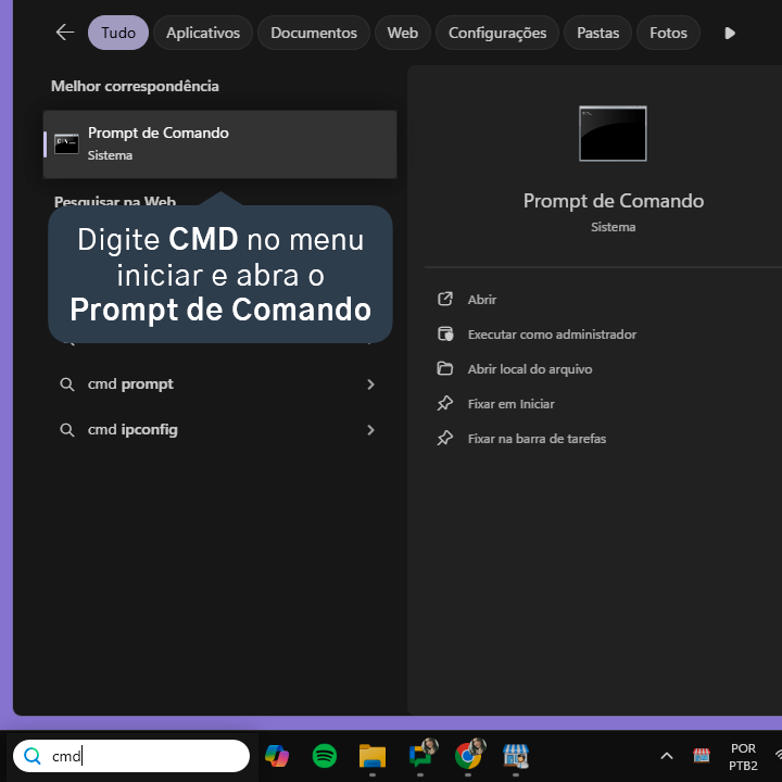 3.2. Se você utiliza os computadores via cabo de rede, é necessário verificar se eles estão na mesma rede pelo Prompt de Comando (CMD). Digite CMD no menu iniciar e abra o Prompt de Comando em ambos os computadores.