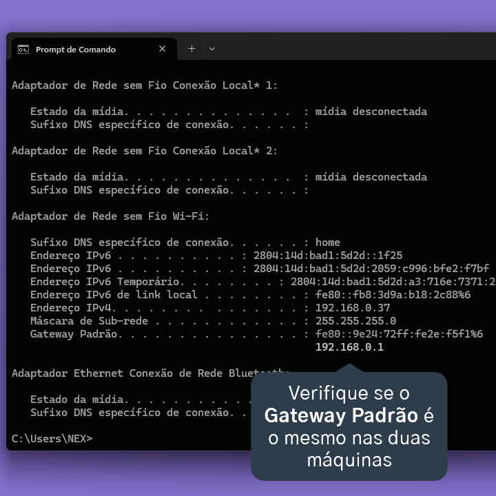 Se os computadores estiverem com o mesmo Gateway Padrão e mesmo assim não estão se comunicando pela rede local, é necessário verificar com um técnico de rede local para analisar o que pode estar causando o bloqueio.