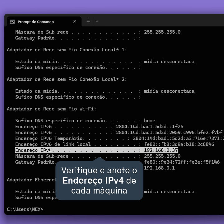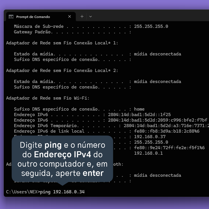 7.2. Digite ipconfig e, em seguida, aperte enter no seu teclado em ambas as máquinas.