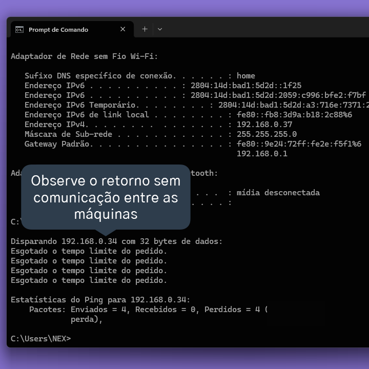 7.7. Caso os computadores não estejam se comunicando, o Windows trará o retorno de “Host de destino inacessível” ou “Esgotado o tempo limite do pedido”.