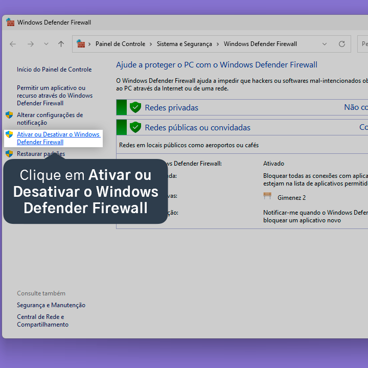 6.2. Clique em Ativar ou Desativar o Windows Defender Firewall.