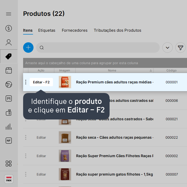 2. Identifique o produto que deseja configurar e clique em Editar - F2.