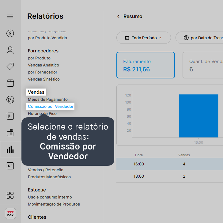 Por meio deste relatório você pode verificar o valor de comissão a ser pago aos seus funcionários. O Nex calcula de forma simples e prática o valor devido no período que você deseja consultar. O sistema considera o percentual de comissão configurado no momento em que a venda foi realizada, ou seja, caso esse percentual seja alterado futuramente, a venda continuará considerando o valor definido no momento da transação. Para aprender a configurar a comissão de venda, clique aqui.