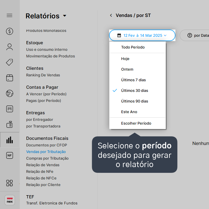 Veja como gerar, pelo Nex, um relatório das vendas separadas por tributação, considerando apenas notas aprovadas pela Secretaria da Fazenda.