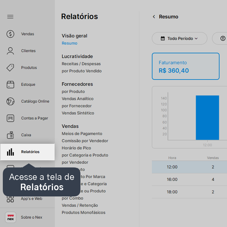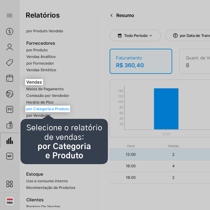 Veja como é simples e prático gerar um relatório de vendas por categoria e produto no Nex.