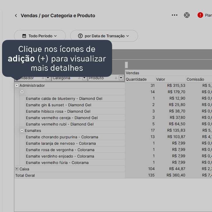 Este relatório permite visualizar os produtos vendidos organizados pelas categorias cadastradas no Nex. Nele, é possível conferir as categorias, os produtos vendidos, as quantidades vendidas, o valor de venda e o valor de comissão para seus funcionários/vendedores.