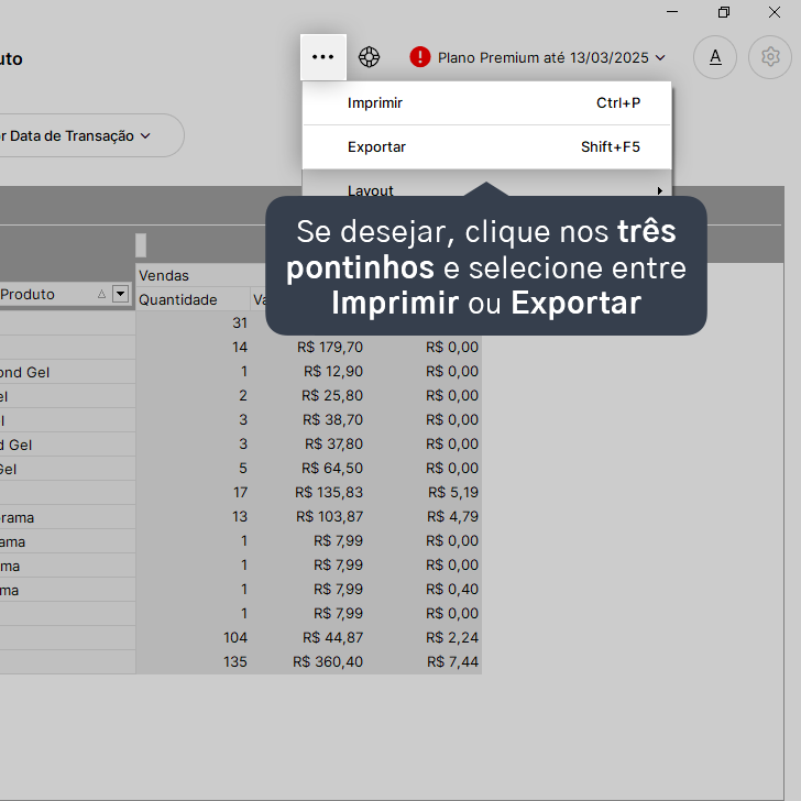 5. Se desejar exportar ou imprimir, clique nos três pontinhos e selecione a opção desejada.