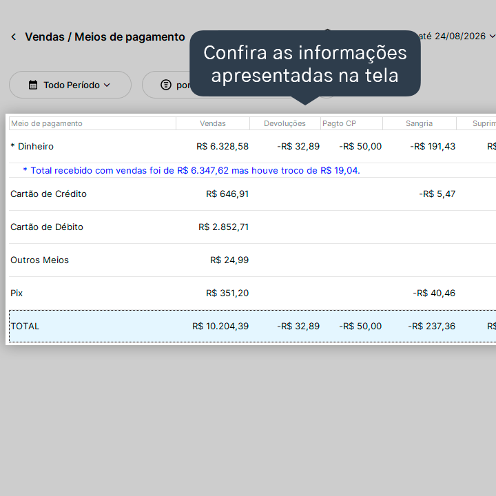 Este relatório reúne os valores movimentados em cada meio de pagamento utilizado nas suas transações. Ao gerá-lo, é possível consultar os meios de pagamento cadastrados e visualizar informações como o valor das vendas em cada um deles, valores de devoluções, valores utilizados no pagamento de contas do Contas a Pagar, valores retirados em sangrias, valores adicionados em suprimentos e a totalização correspondente a cada meio de pagamento.