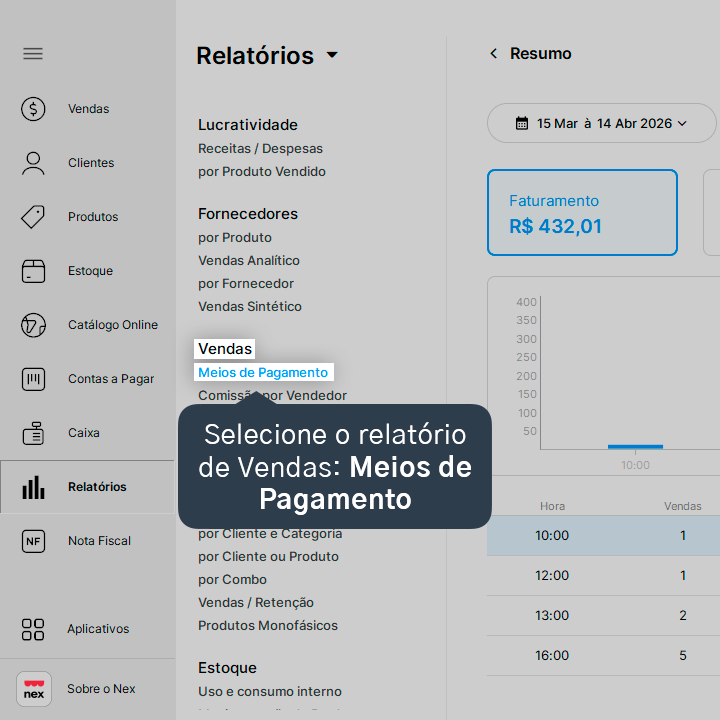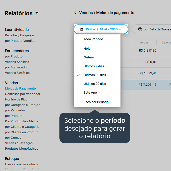 2. Selecione o relatório de vendas: Meios de Pagamento.