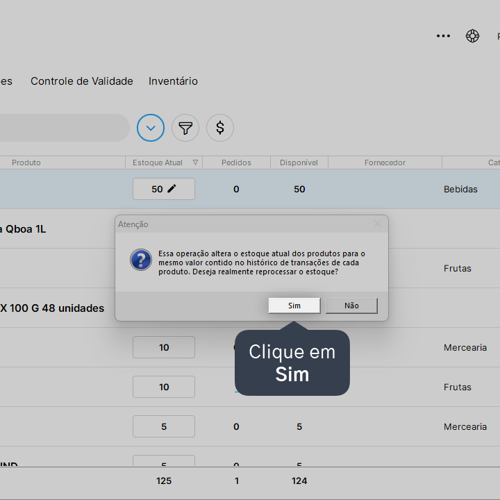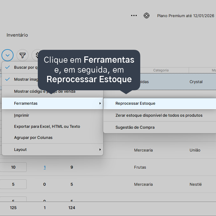 3. Clique na opção Ferramentas e, em seguida, em Reprocessar Estoque.