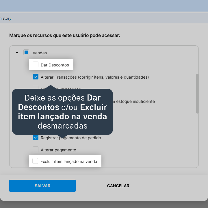 12. Nas permissões de Vendas, deixe a opção Dar Descontos desmarcada, para bloquear a permissão de dar desconto; e/ou deixe a opção Excluir item lançado na venda desmarcada, para bloquear a permissão de excluir itens já lançados na tela de venda caixa.