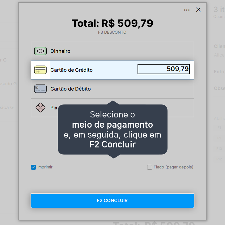 8. Selecione o meio de pagamento utilizado pelo cliente e, em seguida, clique em F2 Concluir.