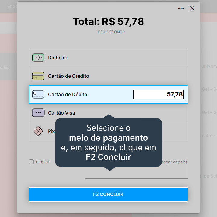 10. Selecione o meio de pagamento desejado e, em seguida, clique em F2 Concluir.