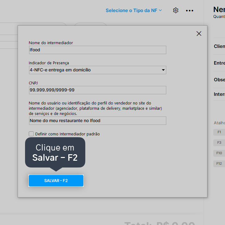 1. Na tela de Nova Venda - F3, clique em Intermediador.