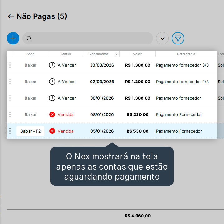 4. O Nex mostrará na tela apenas as contas que ainda estão aguardando pagamento. Para voltar à visualização padrão de todas as contas, basta clicar no ícone de filtro novamente.