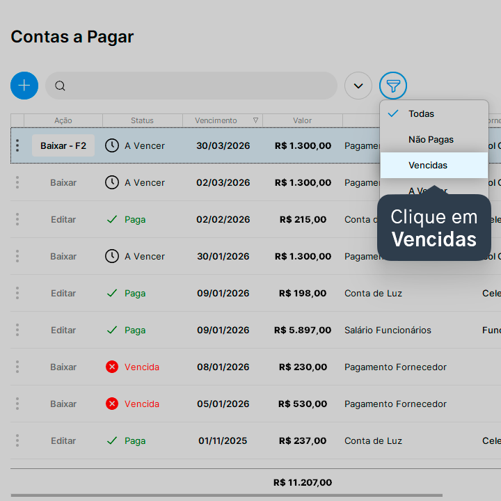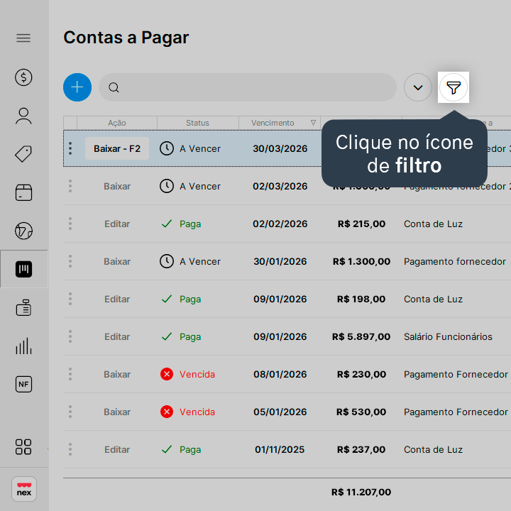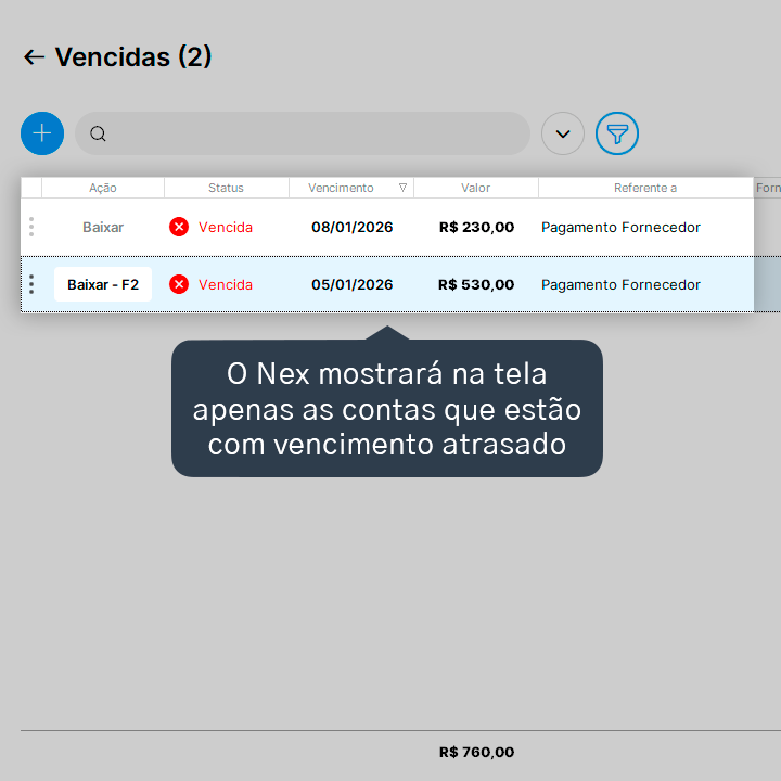 4. O Nex mostrará na tela apenas as contas que estão com vencimento atrasado. Para voltar à visualização padrão de todas as contas, basta clicar no ícone de filtro novamente.